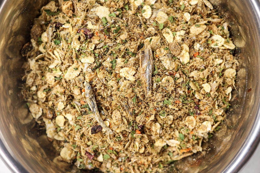 Složení Zvěřina (jelen, daněk, divočák), losos a sezónní ryby, ovoce a zelenina (jablka, hrušky, mrkev, zelí, celer, kapusta, dýně, řepa, mladý zelený hrášek, špenát, petržel, maliny, jahody, rybíz, ostružiny, borůvky), pohanka, ječmen, lněné semeno, celá sušená vejce, sušené kozí mléko, drcené paroží jelena evropského, pivovarské kvasnice (odhořčené), bylinky (bazalka, oregano, tymián, saturejka, šalvěj, fenykl, skořice, zázvor, kurkuma, libeček, ostropestřec mariánský).