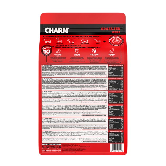 Složení: Čerstvé hovězí (30 %), dehydrované hovězí (28 %), hovězí tuk (9 %), zelený hrášek, cizrna, sladké brambory, hydrolyzát jater (2 %), dehydrované jelení (1 %), dehydrované jehněčí (1 %), dehydrované maso z divočáka (1 %), lněné semínko, dehydrovaný antarktický kril (1 %, přirozený zdroj EPA a DHA), lososový olej (0,5 %), pivovarské kvasnice, jablka, čekanka (přirozený zdroj FOS a inulinu), chřest, srdíčka topinamburů, zelené kiwi, špenát, vaječná membrána (200 mg/kg), brusinky (200 mg/kg), borůvky (200 mg/kg), houby reishi (200 mg/kg), houby turkey tail (200 mg/kg), houby chaga (200 mg/kg), kolagenové peptidy (200 mg/kg), Ascophyllum nodosum, ananas (zdroj bromelainu) (200 mg/kg), kořen kurkumy (200 mg/kg), glukosamin hydrochlorid, chondroitin sulfát, spirulina.