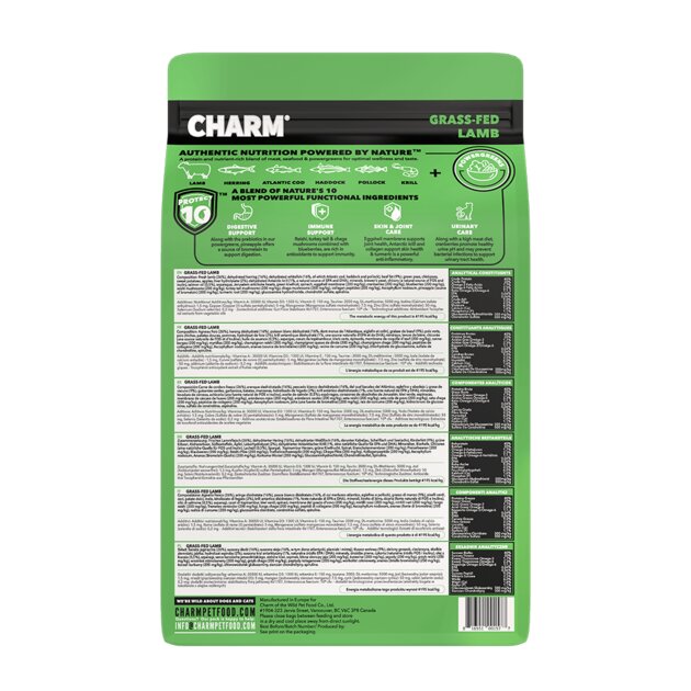 Složení: Čerstvé jehněčí (26 %), dehydrovaný sleď (16 %), dehydrované bílé ryby (16 %, z toho treska obecná, treska skvrnitá a treska polak), hovězí tuk (9 %), zelený hrášek, cizrna, sladké brambory, jablka, hydrolyzát jater (2 %), dehydrovaný antarktický kril (1 %, přirozený zdroj EPA a DHA), minerály, pivovarské kvasnice, čekanka (přirozený zdroj FOS a inulinu), lososový olej (0,5 %), chřest, srdíčka topinamburů, zelené kiwi, špenát, vaječná membrána (200 mg/kg), brusinky (200 mg/kg), borůvky (200 mg/kg), houby reishi (200 mg/kg), houby turkey tail (200 mg/kg), houby chaga (200 mg/kg), kolagenové peptidy (200 mg/kg), Ascophyllum nodosum, ananas (zdroj bromelainu) (200 mg/kg), kořen kurkumy (200 mg/kg), glukosamin hydrochlorid, chondroitin sulfát, spirulina.