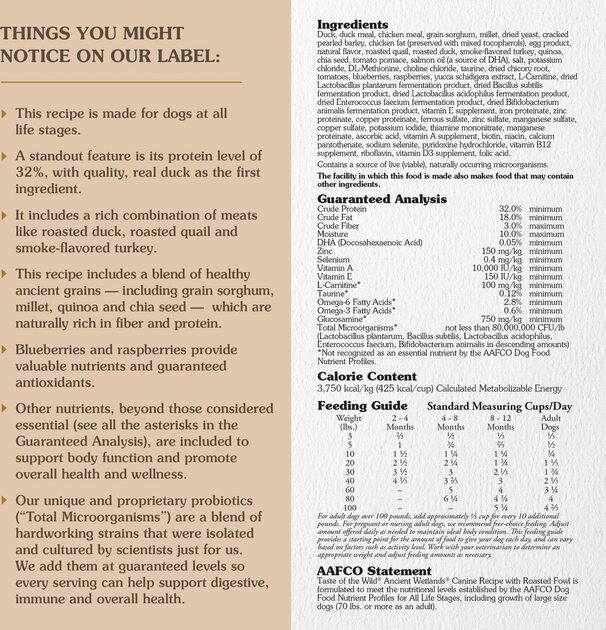Složení: Kachna, kachní moučka, kuřecí moučka, čirok, proso, sušené kvasnice, ječmen, kuřecí tuk (konzervovaný směsí tokoferolů), vaječný produkt, přírodní aroma, pečená křepelka, pečená kachna, uzené krůtí s příchutí, quinoa, chia semínko, rajčatový odpad, lososový olej (zdroj DHA), sůl, chlorid draselný, DL-methionin, chlorid choliny, taurin, sušený kořen čekanky, rajčata, borůvky, maliny, extrakt z yucca schidigera, L-karnitin, sušený výrobek fermentace Lactobacillus plantarum, sušený výrobek fermentace Bacillus subtilis, sušený výrobek fermentace Lactobacillus acidophilus, sušený výrobek fermentace Enterococcus faecium, sušený výrobek fermentace Bifidobacterium animalis, doplněk vitamínu E, chelát železa, chelát zinku, chelát mědi, síran železnatý, síran zinečnatý, síran manganatý, síran měďnatý, jodičnan draselný, mononitrát thiaminu, chelát manganu, kyselina askorbová, doplněk vitamínu A, biotin, niacin, vápenatý pantotenát, selenit sodný, hydrochlorid pyridoxinu, doplněk vitamínu B12, riboflavin, doplněk vitamínu D3, kyselina listová.